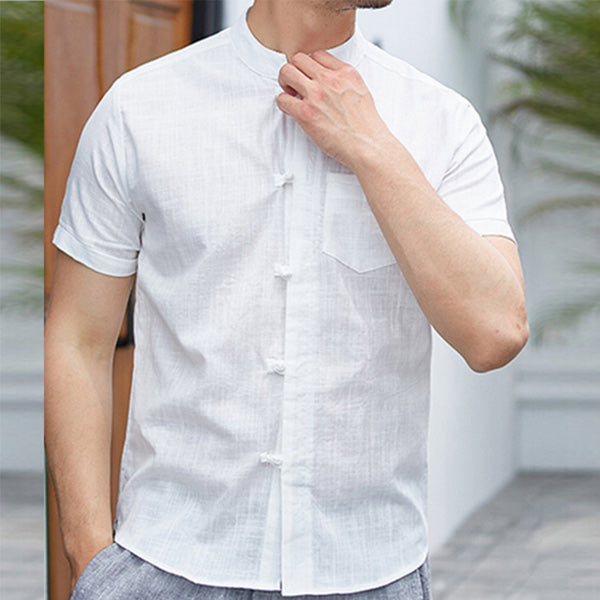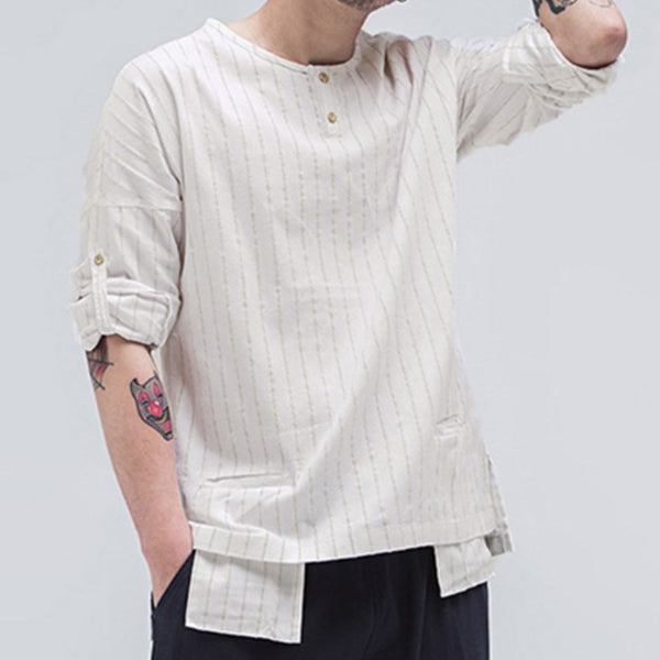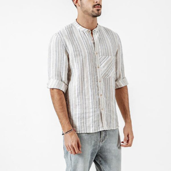 Herren Stehkragen gewaschen Baumwolle und Leinen gestreift bequemes Hemd