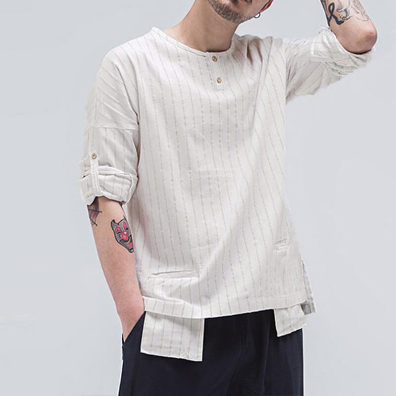 Vyriškos mados dvigubos kišenės su apvalia apykakle, dryžuotomis medvilninėmis ilgomis rankovėmis