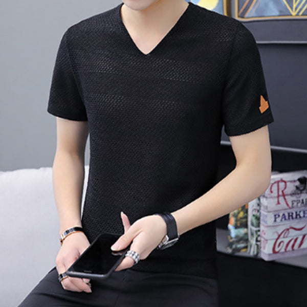 Kvėpuojantys, tuščiaviduriai marškinėliai su V formos iškirpte ir megztu dugnu dideliems vyrams