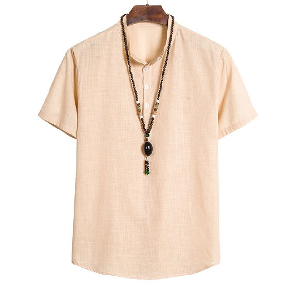 Camisa de algodón y lino para hombres con cuello redondo y bolsillo suelto.