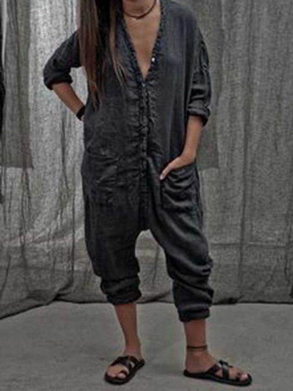 Traje casual de mujer en color liso con manga larga y cuello en V