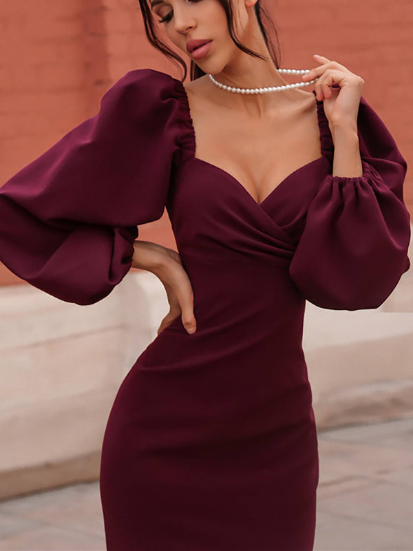 Vestido a media pierna con cuello en v vestido bodycon con mangas hinchadas